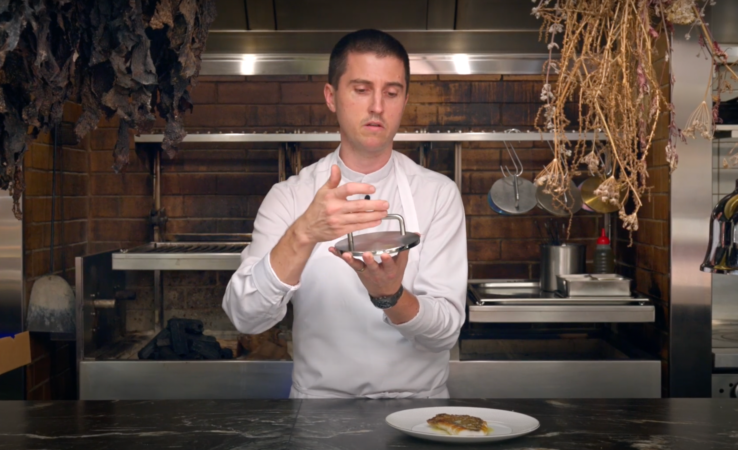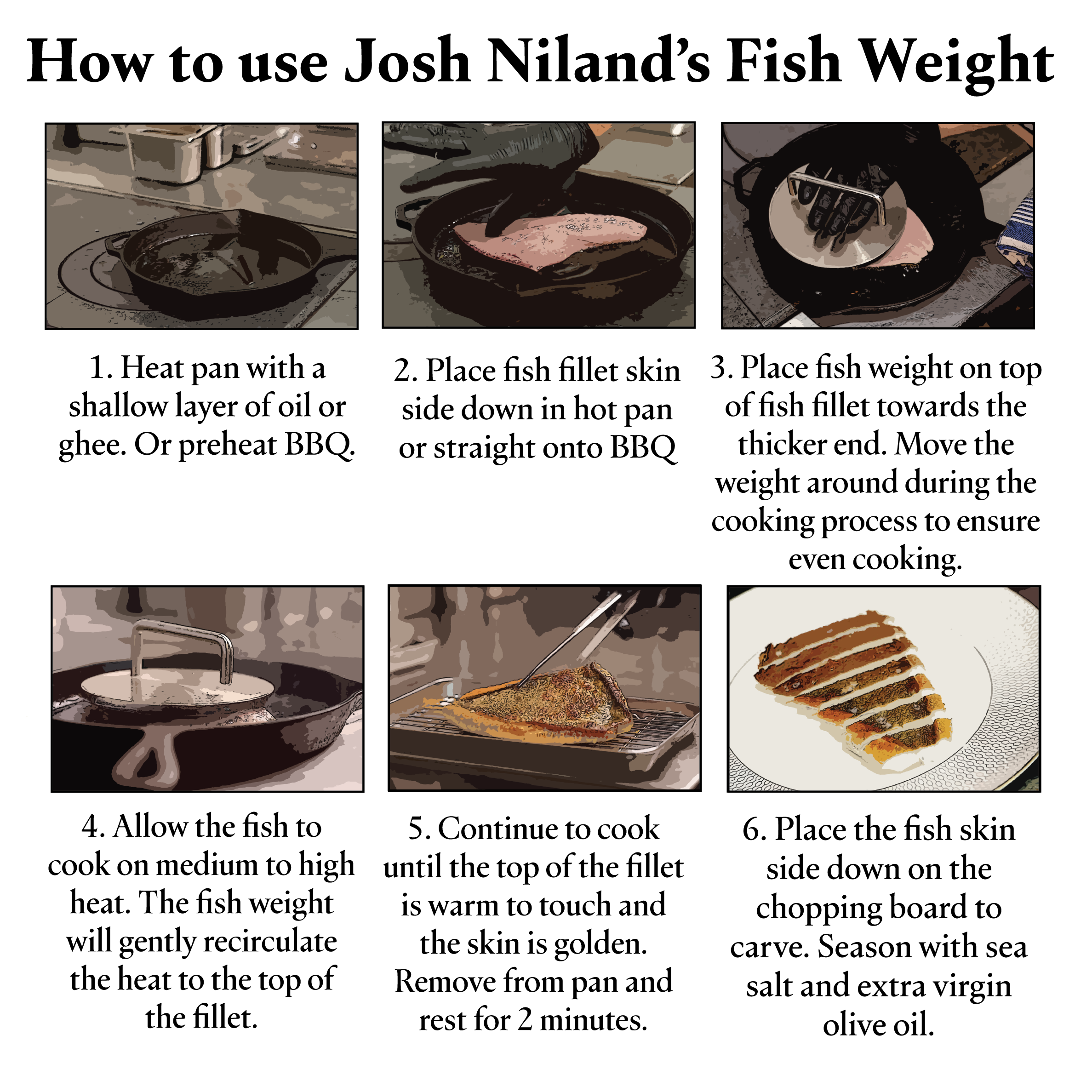 The Fish Weight is a professional-grade, food-safe stainless steel press designed by Chef Josh Niland. It keeps fish fillets flat in the pan, ensuring evenly crisp, golden skin without the need to finish in the oven or to flip onto the delicate flesh.