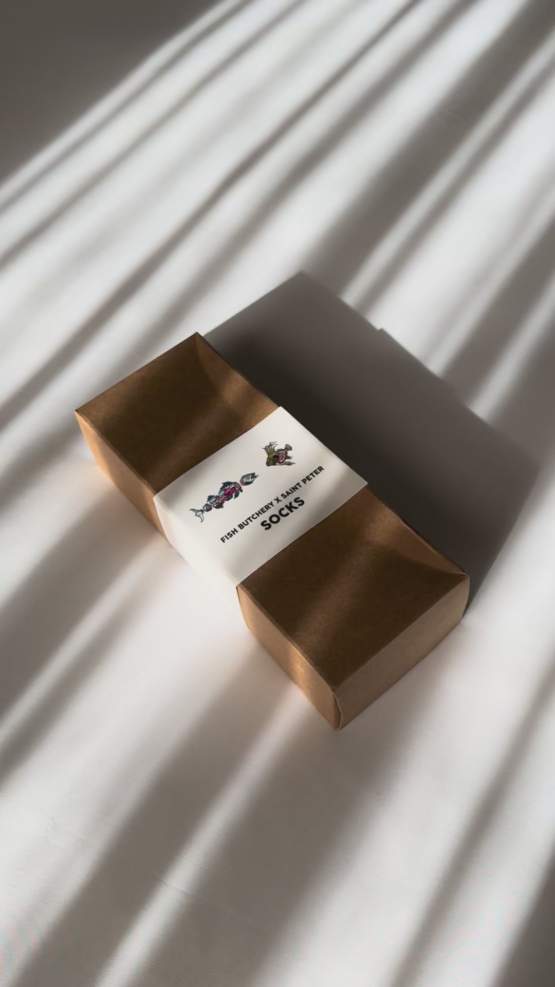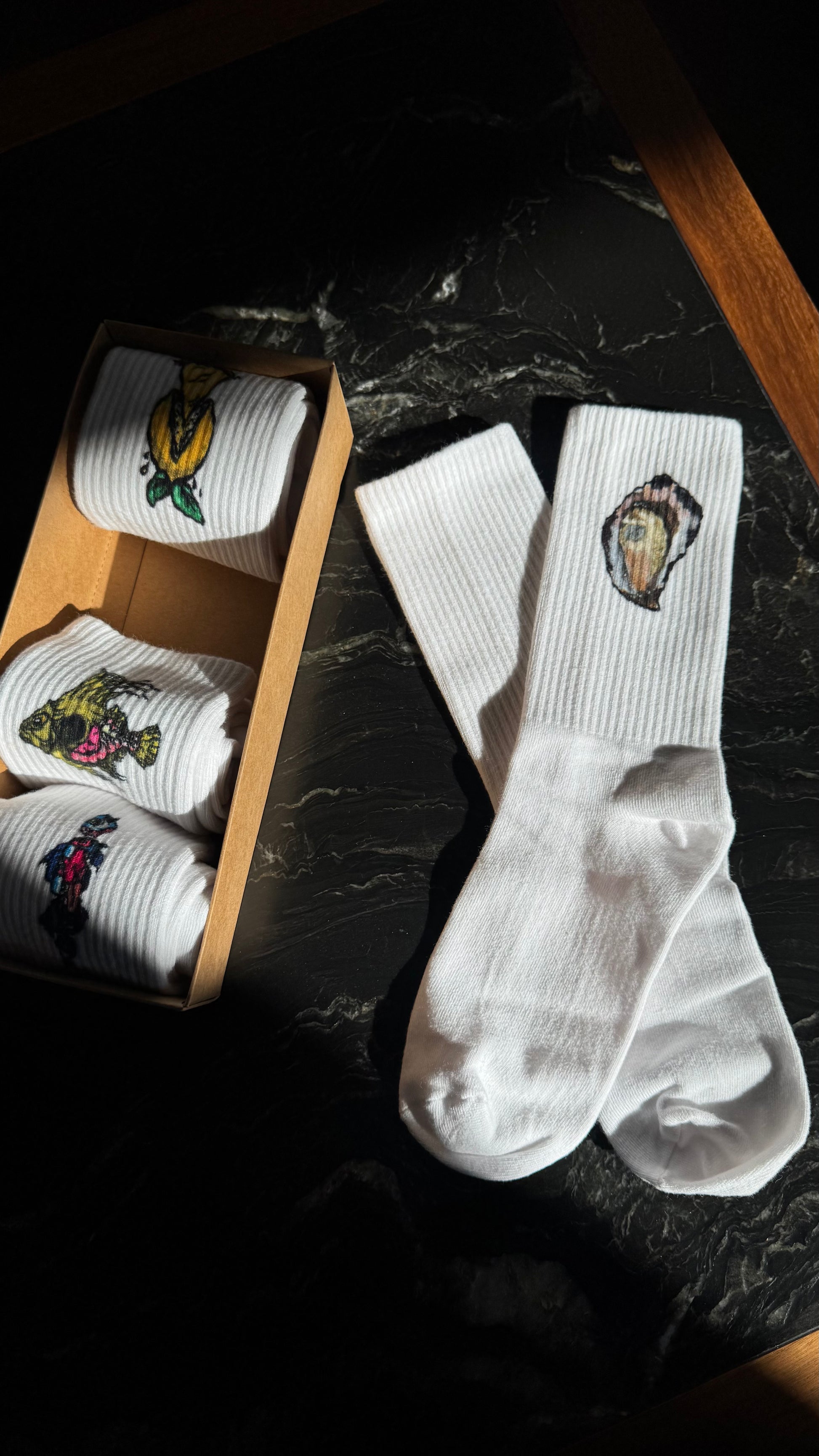 One size fits most adults. Ribbed cotton socks printed with the Saint Peter John Dory, The Fish Butchery Spanish Mackerel, Our Lemon Tart and a Perfect Oyster.