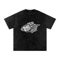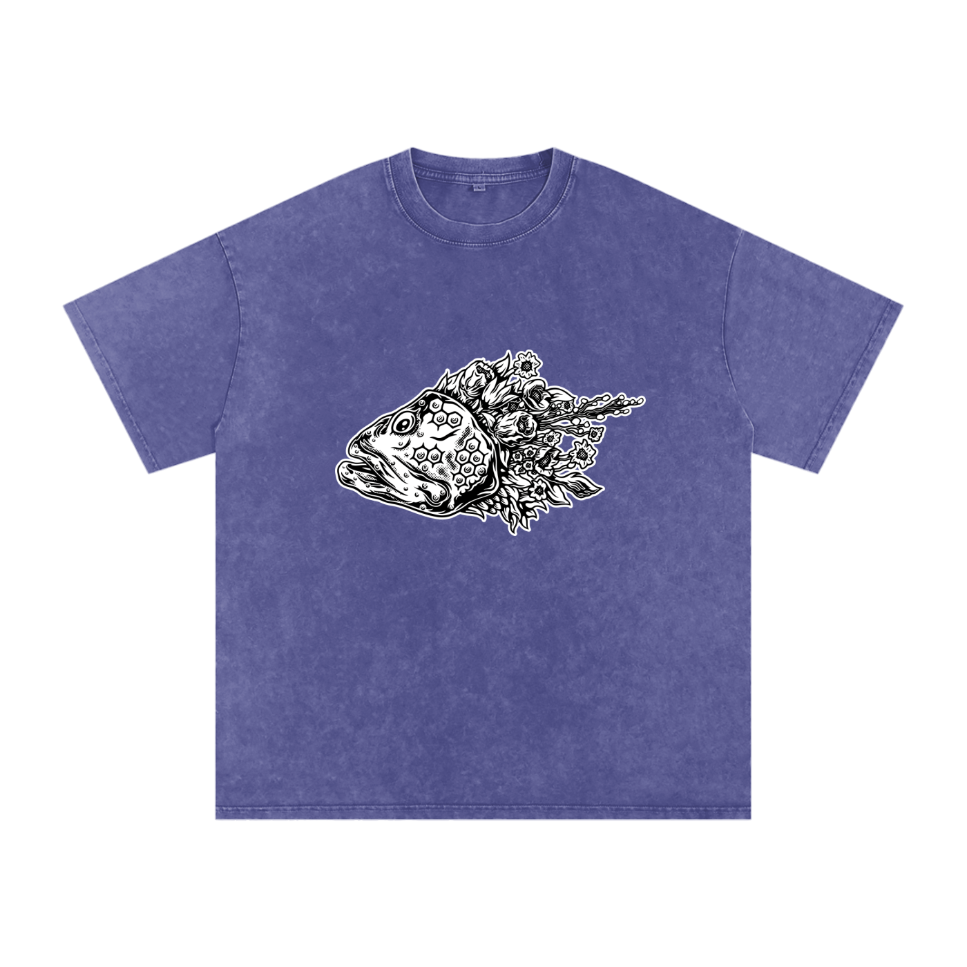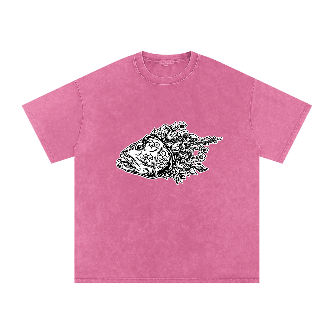 Fish & Flowers by Nic Brownlee printed on a 100% cotton acid wash t-shirt.